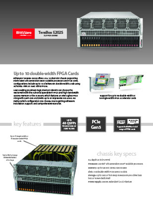 BittWare’s TeraBox-5202S offers a 5U, 10 dual-slot chassis supporting Intel’s latest 4th Generation Xeon Scalable processors and PCIe Gen5. Configurations include up to 10 of BittWare’s double-width cards using Achronix, Altera, or AMD FPGAs.
